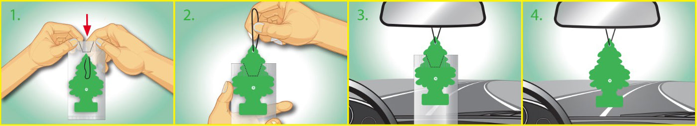 - Hæng duftfriskeren op i bilens bakspejl som anvist - med posen på